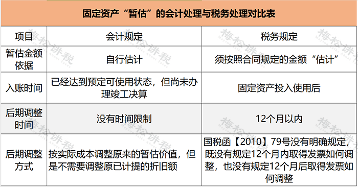由于《國家稅務總局關于貫徹落實企業所得稅法若干稅收問題的通知》(國稅函[2010]79號)對于暫估計稅基礎固定資產的后期調整方式未給出明確規定,因此各地稅務機關或稅務人員按照各自不同理解和觀點執行,存在很大的稅收爭議,企業需要特別注意該問題可能給企業帶來的稅務風險。 具體的賬務處理如下: