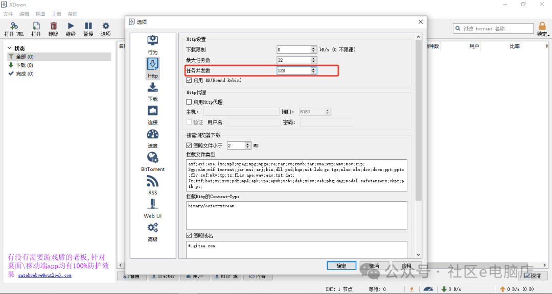 功能特性支持?jǐn)嗑€重連、http header自定義字段、手動設(shè)置并發(fā)數(shù)(最大128)、多IP輪詢節(jié)點下載、BitTorrent 內(nèi)置tracker list設(shè)置; 支持tls1.0/1.1/1.2/1.3-sni、DHT ipv4+ipv6; 支持全局限速和自定義全局代理設(shè)置。 使用介紹在設(shè)置中,可以將任務(wù)并發(fā)數(shù)改成128,提高下載速度。
