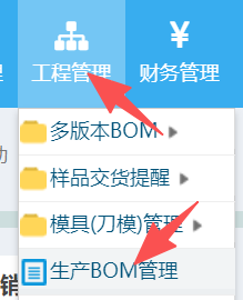操作步驟:工程管理-生產BOM管理,如下圖: