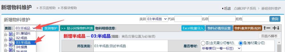 進入界面后,左側類型選半成品類型,如下圖所示: