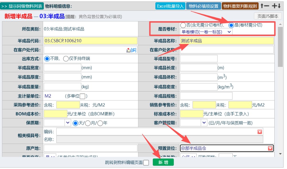 選中對應的類別后,進入到資料輸入界面,注意:是否卷材欄位選“是”,輸入其他相關信息,點擊“新增”完成,如下圖所示:
