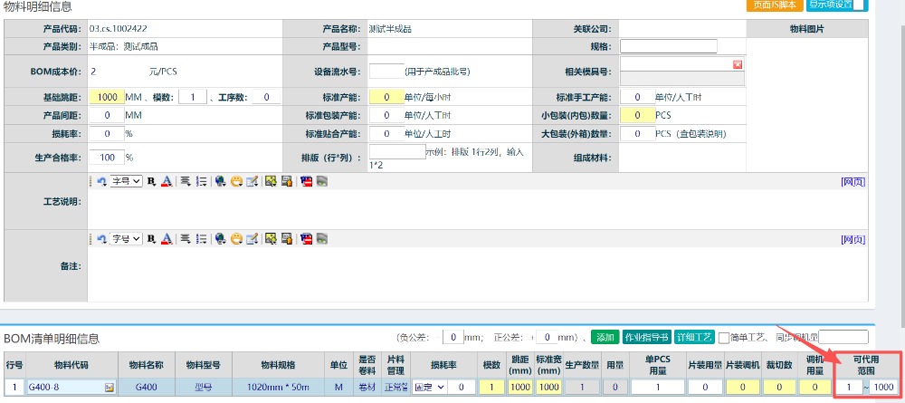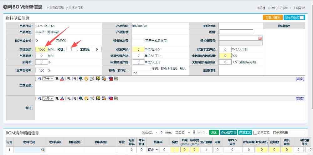 進入到編輯頁面后,輸入固定的跳距,模數,跳距固定為1000,模數為1,如下圖所示: 固定跳距模數原因說明:由于半成品為卷料,單位固定為M2(平方米),因此設置材料比例為1比1設置。