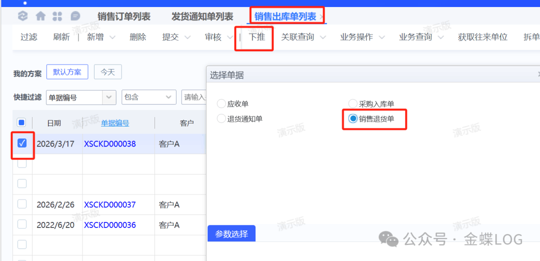 這個時候的話可以考慮從【銷售出庫單列表】找到錯誤的那行物料,勾選之后下推【銷售退貨單】。