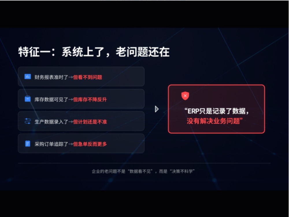 自檢清單今天給大家一個自檢清單。如果你發現企業中了3個以上,說明你的ERP基本是在虧本運行。 特征一:系統上了,但老問題還在財務報表能出了,但老板還是看不到關鍵問題;庫存可以實時查了,但庫存不降反升;生產數據錄進去了,但計劃還是不準。ERP只是記錄了數據,沒有解決業務問題。 特征二:員工同時用著兩套系統采購部:...