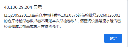 點晴ERP提示:當前倉庫物料卷料的待檢批號的倉庫待檢品卷數-3卷不滿足本次品檢卷數3,請查詢該批號流水是否已經調整成合格品或者不在待檢倉中,如何解決? ? ?情況描述:在采購品檢入庫提交時彈出提示:當前倉庫物料卷料的待檢品卷數不滿足本次品檢數。 原因1:是當前倉庫庫存對應這個批號的物料已經出掉了,找不到庫存所以提...