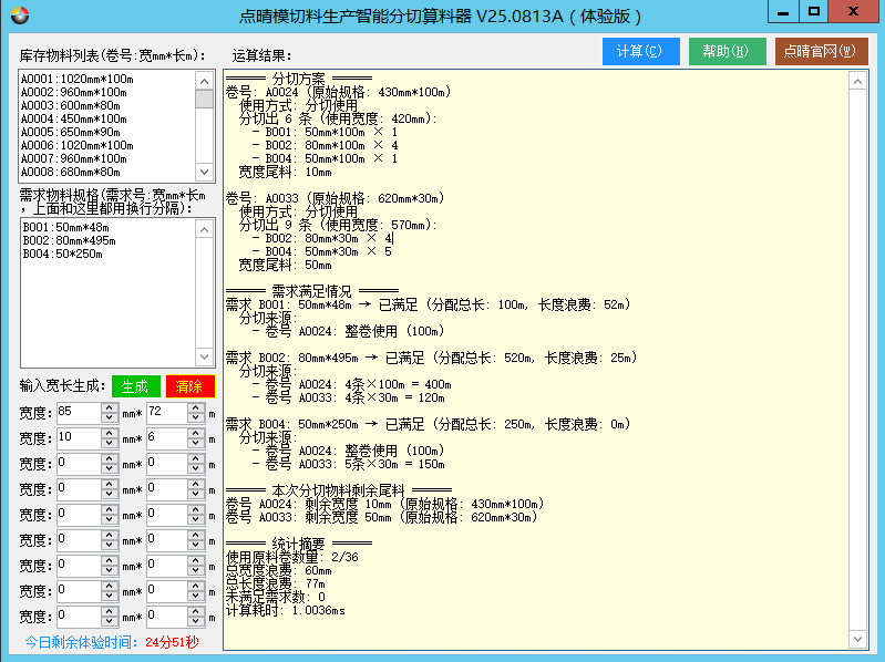 點晴ERP模切料生產智能分切算料器,是深圳市點晴信息技術有限公司專門為模切行業推出的一款模切材料生產分切管理智能算料的程序(從點晴模切ERP系統生產版中剝離出來為一個可以獨立運行的程序),可以快速高效的給出最佳分切用料結果,實現最小分切卷數、最少浪費的目標。支持逾萬個原始在庫物料規格設置、數千個不同規格的生產物料需求在...