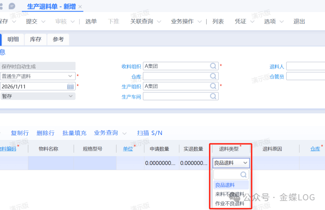 問題描述平時在進行生產退料的時候,單據上有個退料類型字段:“良品退料”、“來料不良退料”和“作業不良退料”,它們分別表示什么意思?學完本篇文章,您將學會:①生產退料單【退料類型】的作用。②不同退料類型對生產用料清單的影響③如何默認【來料不良】和【作業不良】庫存狀態?