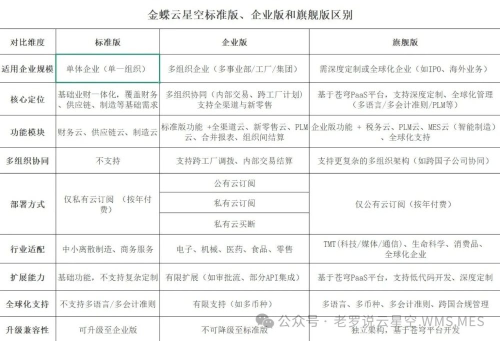 ?金蝶云星空標準版、企業版、旗艦版區別1.適用企業規模:標準版用于單體企業、企業版用于多組織企業、旗艦版用于需深度定制或全球化企業(如IPO、海外業務)和需要AI功能。2.核心定位:標準版:基礎業財一體化,覆蓋財務供應鏈、制造等基礎需求;企業版:多組織協同(內部交易、跨工廠計劃)支持全渠道與新零售;旗艦版:基于蒼穹Pa...