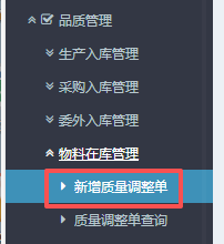 點晴ERP-質量調整單-操作流程 進入ERP系統之后,在左側的功能菜單里找到“品質管理”,點開“物料在庫管理”,點擊“新增質量調整單”。 2.進入界面后,按圖操作:先選擇物料大類,然后點擊查詢。 注:如果有需要調整庫存位置:先點擊對應物料信息,然后點擊右邊的“按明細調整貨位”并在右邊勾上對應物料。 ...