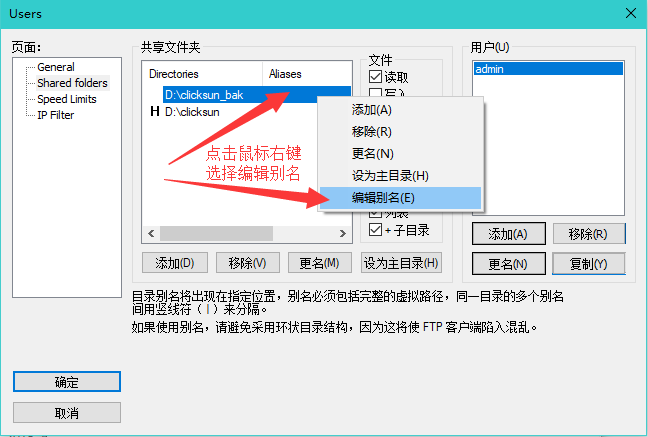 除了主目錄外的其他目錄都需要增加別名,點擊鼠標右鍵選擇編輯別名: