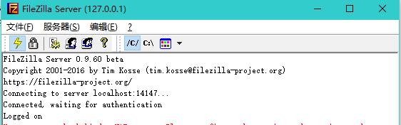 3、啟動FileZilla Server的主界面,如果出現平【Logged on】或【Server online】的字樣,表示已經順利上線。點擊菜單中的閃電圖標切換上線、離線,即可手動開啟或關閉FTP服務。