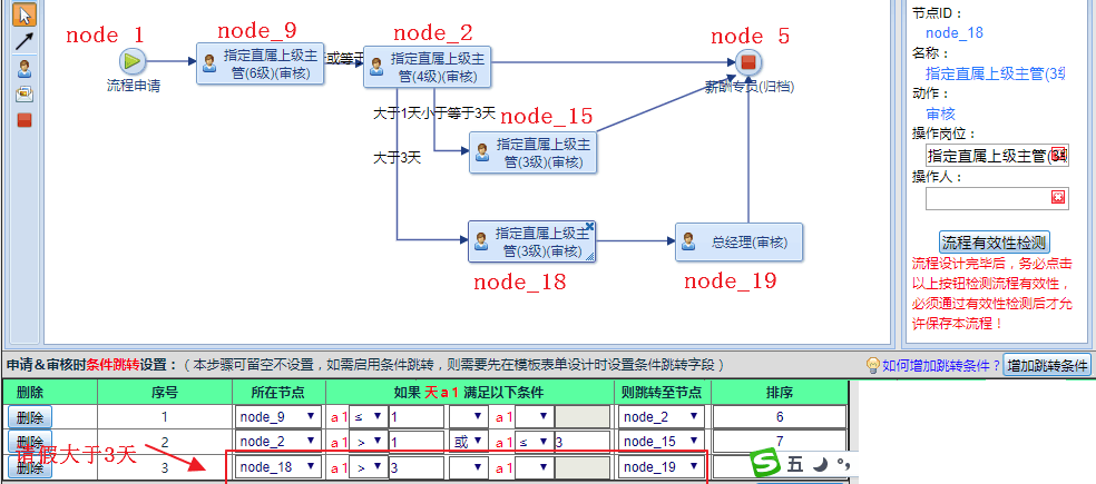 ![]() 像上面這個流程圖的跳轉(zhuǎn)條件設(shè)置就是錯誤的,node_9和node_18都只有一個流向,明顯不需要設(shè)置條件跳轉(zhuǎn),node_2有三個流向,只有node_2才需要設(shè)置跳轉(zhuǎn)條件。 相關(guān)教程:
